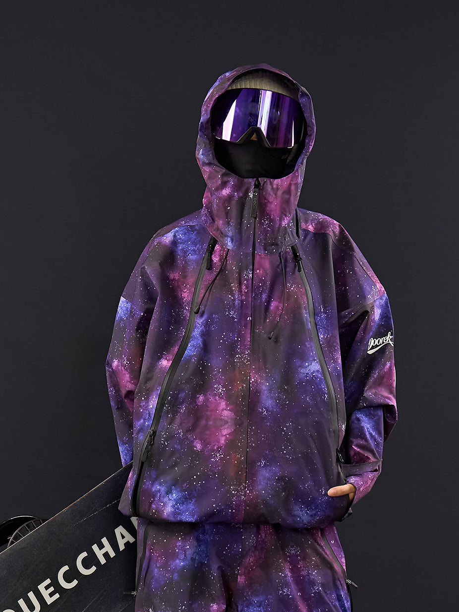 Elevate your mountain game with this dreamy, starry ski shell—where cosmic allure meets uncompromising performance. The deep purple base is splashed with swirling nebula hues and scattered star-like specks, creating a galaxy-inspired look that turns heads on every run.