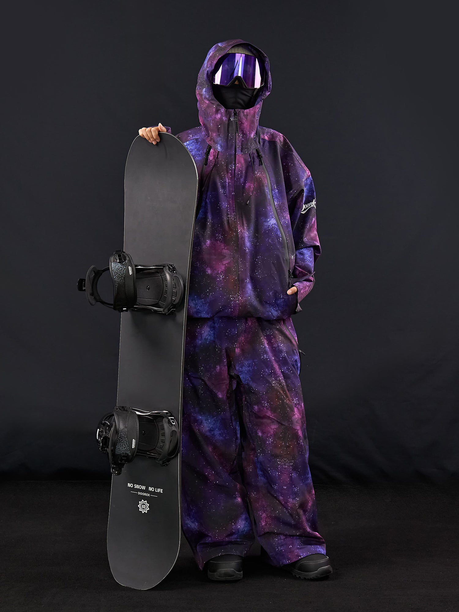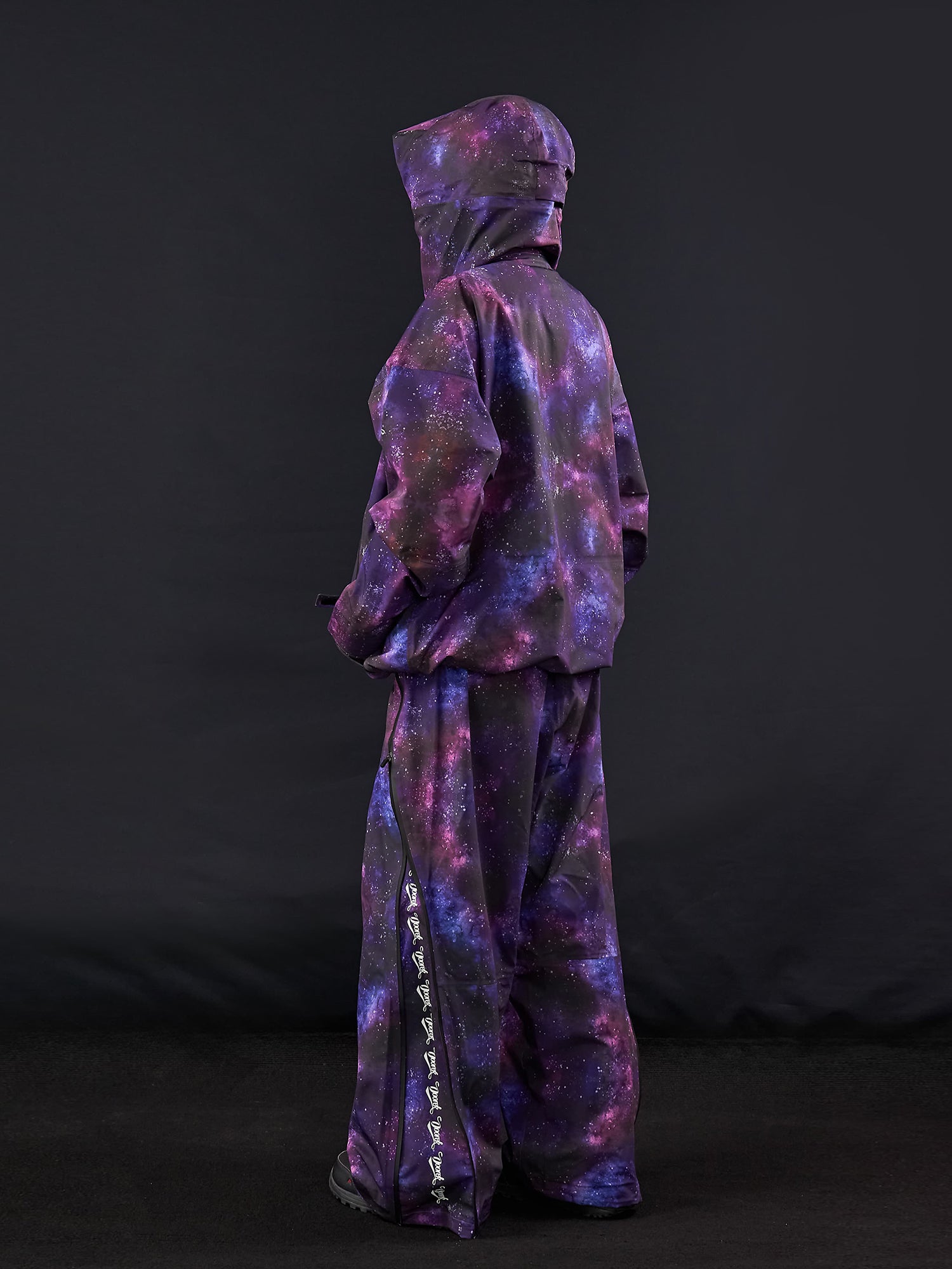 Elevate your mountain game with this dreamy, starry ski shell—where cosmic allure meets uncompromising performance. The deep purple base is splashed with swirling nebula hues and scattered star-like specks, creating a galaxy-inspired look that turns heads on every run.